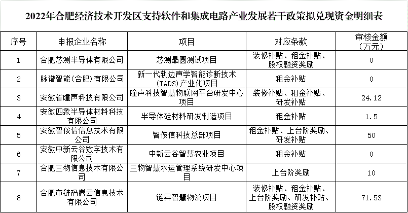 凭证《合肥经济手艺开发区支持软件和集成电路工业生长若干政策》(合经区管〔2022〕195号)、《合肥经济手艺开发区支持软件和集成电路工业生长若干政策实验细则》(合经区投促〔2023〕2号)等有关文件划定,,,,,,现对2022年合肥经济手艺开发区支持软件和集成电路工业生长若干政策拟兑现资金明细表举行公示,,,,,,公示期7天(2023年11月15日至2023年11月21日)。。。。。